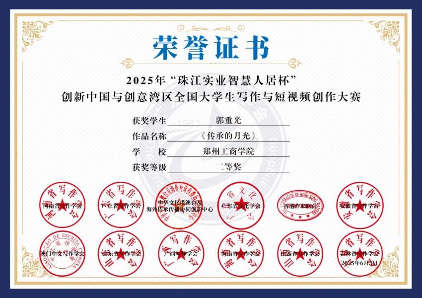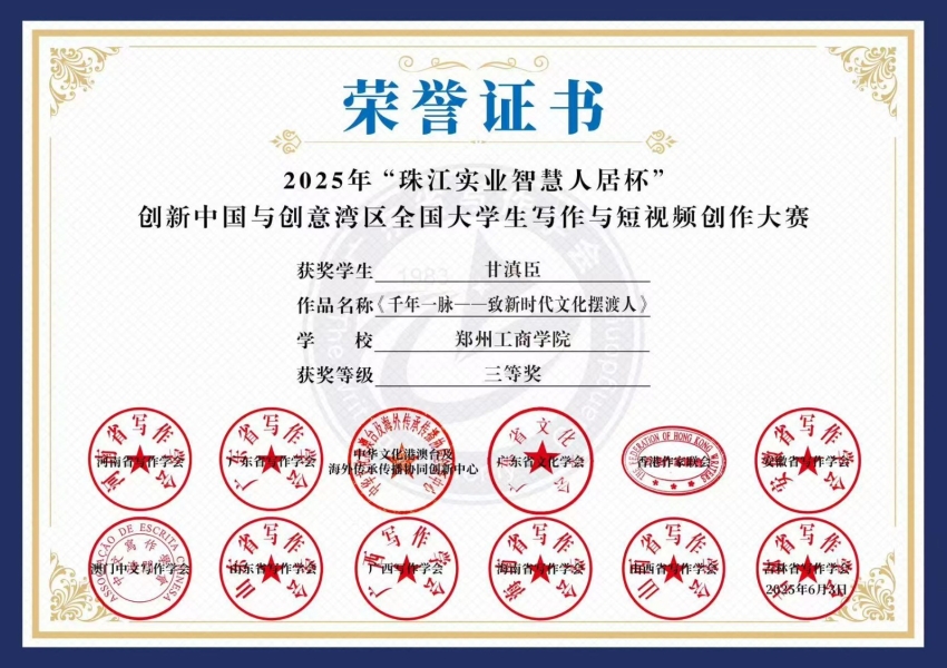 近日,2025年“珠江实业智慧人居杯”创新中国与创意湾区全国大学生写作与短视频创作大赛圆满落幕。基础教学部组织我校学生积极参与该项赛事,多名学子在比赛中表现优异,斩获多个奖项,充分展现了我校学子扎实的文学素养与深厚的文化表达力。